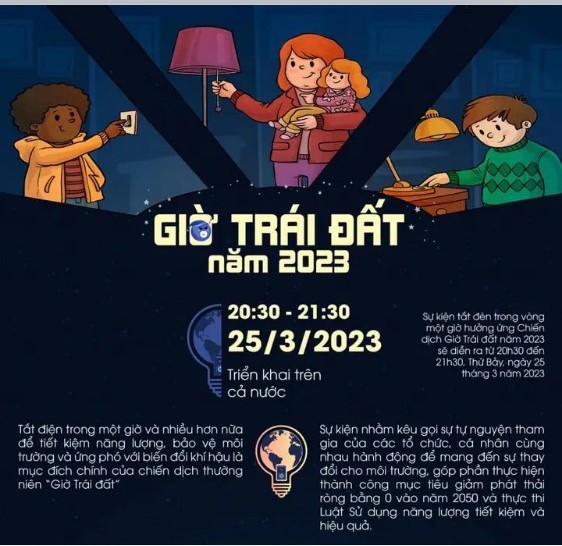 Giờ Trái Đất năm 2023 được phát động với chủ đề “Tiết kiệm điện - thành thói quen” nhằm tuyên truyền, nâng cao nhận thức cộng đồng về tiết kiệm điện năng. Vận động cộng đồng tham gia bảo vệ tài nguyên điện, tắt điện trong một giờ và nhiều hơn nữa để tiết kiệm năng lượng, bảo vệ môi trường và ứng phó với biến đổi khí hậu là mục đích chính của chiến dịch thường niên “Giờ Trái đất”.